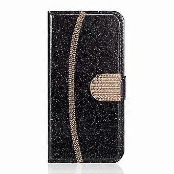 جراب لآيفون 14 برو أسود بريق بطاقة فتحة جلد سلسلة ذهبية محفظة ماسية رقم 6165