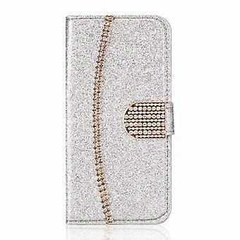 جراب لآيفون 14 برو فضي بريق بطاقة فتحة جلد سلسلة ذهبية محفظة ماسية Ee1006