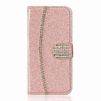جراب لآيفون 14 برو وردي جولد بريق بطاقة فتحة سلسلة جلدية الماس المحفظة Ee1008