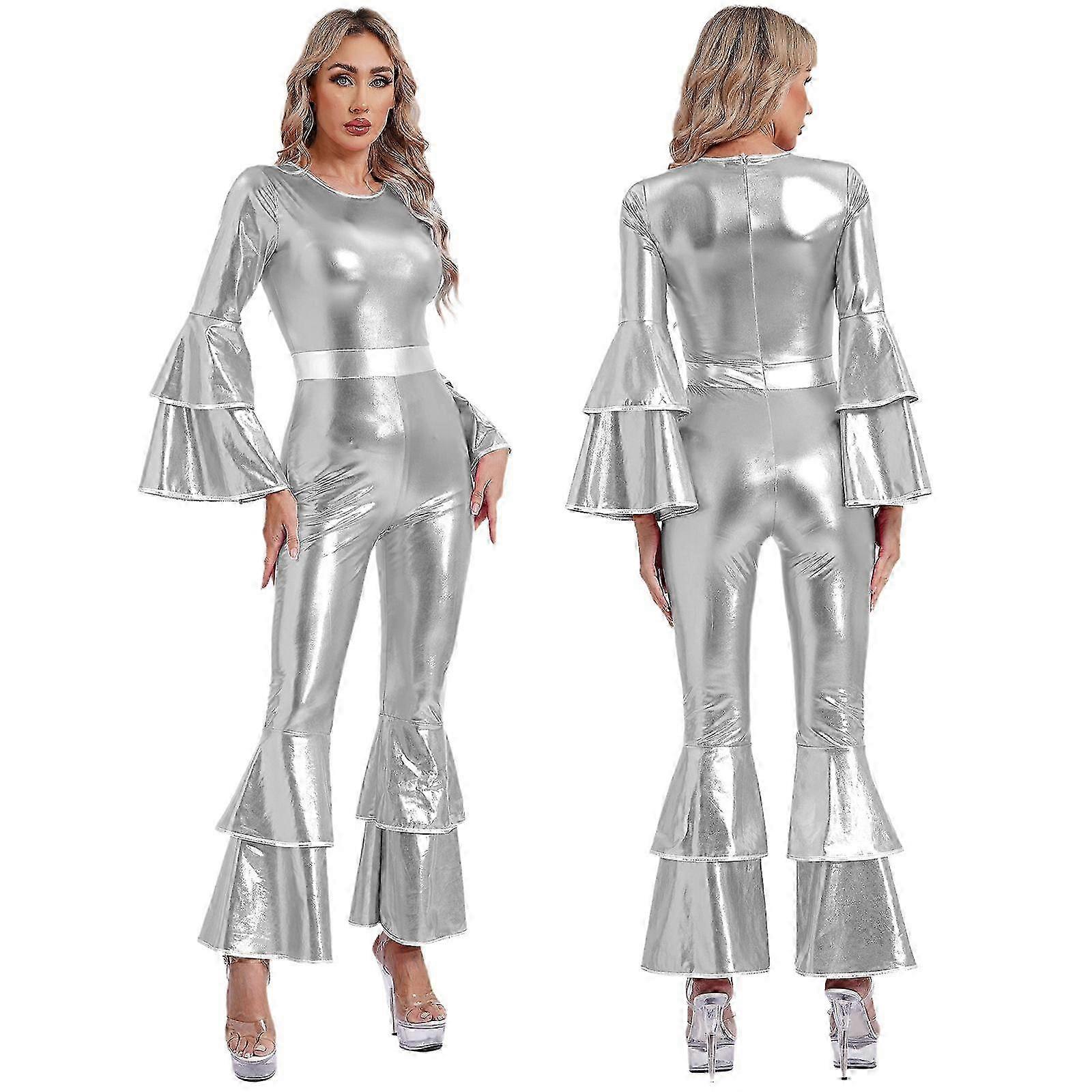 Womens Vintage 70S Disco Shiny Jumpsuit Bell Bottom Hippie Romper Cheerleading Uniform Halloween Cosplay Theme Party Costume