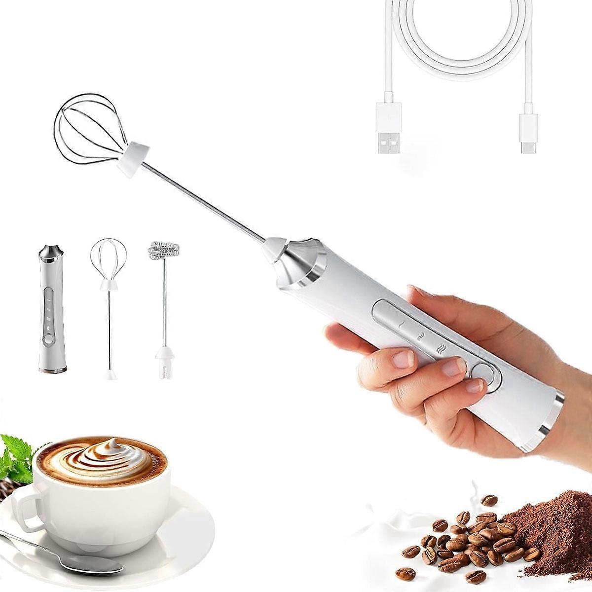 Electric Milk Frother, Rechargeable Handheld Electric Milk Frother With 2 Heads And 3 Speeds, White