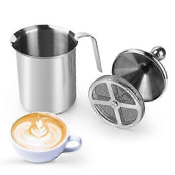 CREAMY MILK FOAM: The milk frother creates a thicker, longer-lasting creamy foam to top delicious hot or cold drinks in 30 seconds or less, without electricity or batteries. HIGH QUALITY STAINLESS STEEL: Made from stainless steel the lid has an integrated double mesh and a grippy handle that is durable and versatile. Ideal for home use, cafes, and the perfect gift for coffee lovers. EASY TO USE AND CLEAN - Measure milk into the jug, place the jug inside, and secure the lid, pump the handle up and down for about 20-30 seconds until the foam reaches the desired consistency. More economical than battery-powered frothers and expensive electric milk frothers. Dishwasher-safe.