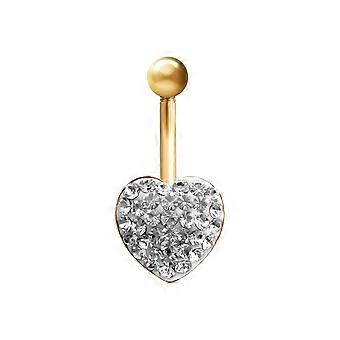Jewelco London Ladies 9ct Yellow Gold White Round Crystal Love Heart Banana Belly Bar, 10mm