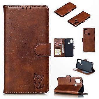 حافظة جلدية منقوشة بنمط القط مع حامل وفتحات للبطاقات ومحفظة وإطار صور لهاتف Galaxy A21s (أحمر)