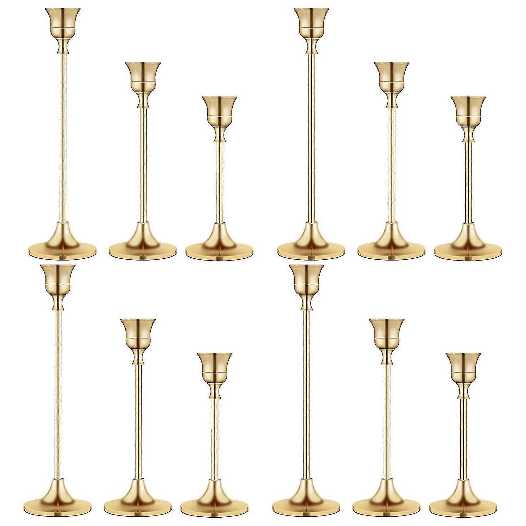 1.SLEEK SURFACE: sophisticated surface treated, this candlestick holder set is very sleek, will be an eye-catching decorative piece on your table or fireplace mantle or shelf2.FUN & ELEGANT CANDLE HOLDER: exquisite candle holder, stemmed and vintage design, looks elegant and fits various occasions, like daily home interior decoration, parties, Halloween decor, home festive dinning table decorations3.EASY TO GO WITH various home interior: vintage look but matte the candle stands combine antique and modern touch, will go well with various styles of home interior, modern, mid-century modern, french country, rustic4.Unique Design- European Retro Design candle stick long holder with 3 different heights create an elegant visual effect and provides you a pretty romantic atmosphere.5.Multi-Occasional and Great Gift Idea-The candlestick holder set can be placed in living room, bedroom, bar,dinner table, to create a romantic atmosphere for wedding,home decor,party,halloweseen birthday Christmas, thanksgiving Day or other special occasions.Best gift for your parents, lovers, teachers, or friendsSize:Large size: 6.5 x 23cmMedium size: 6.5 x 20cmSmall size: 6.5 x 16.5cmMaterial:Aluminum alloycolour:French GoldPackage Contents:4 * Small candle holder4 * Medium Candlestick4 * Large candle holderOnly the above package content, other products are not included.Note: Light and different displays may cause the color of the item in the picture a little different from the real thing. The measurement allowed error is +/- 1-3cm.