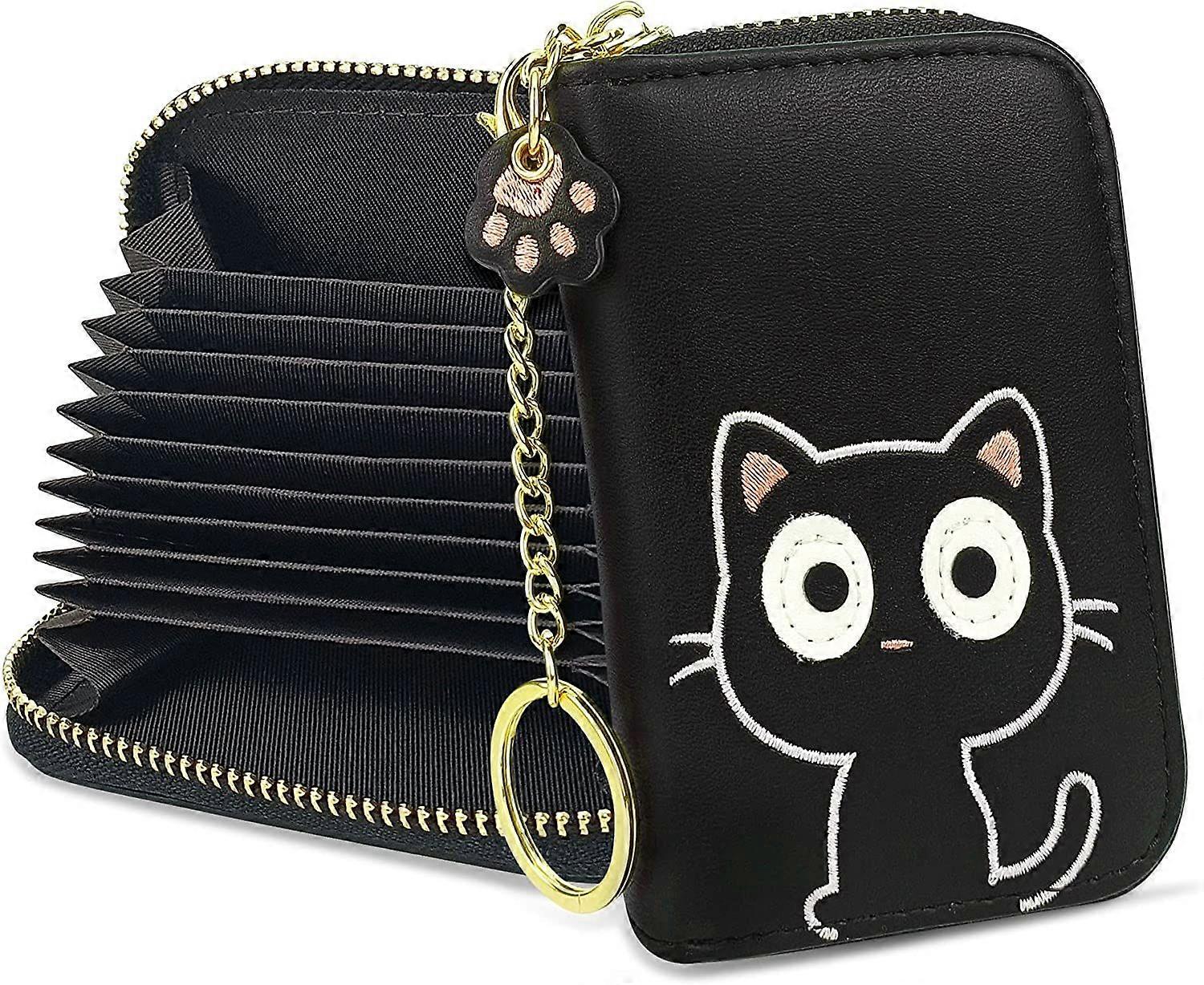 Cute Credit Card Holder for Women,Small Leather Zipper RFID Blocking Card Holder Wallet with Removable Keychain (Black) (1pc