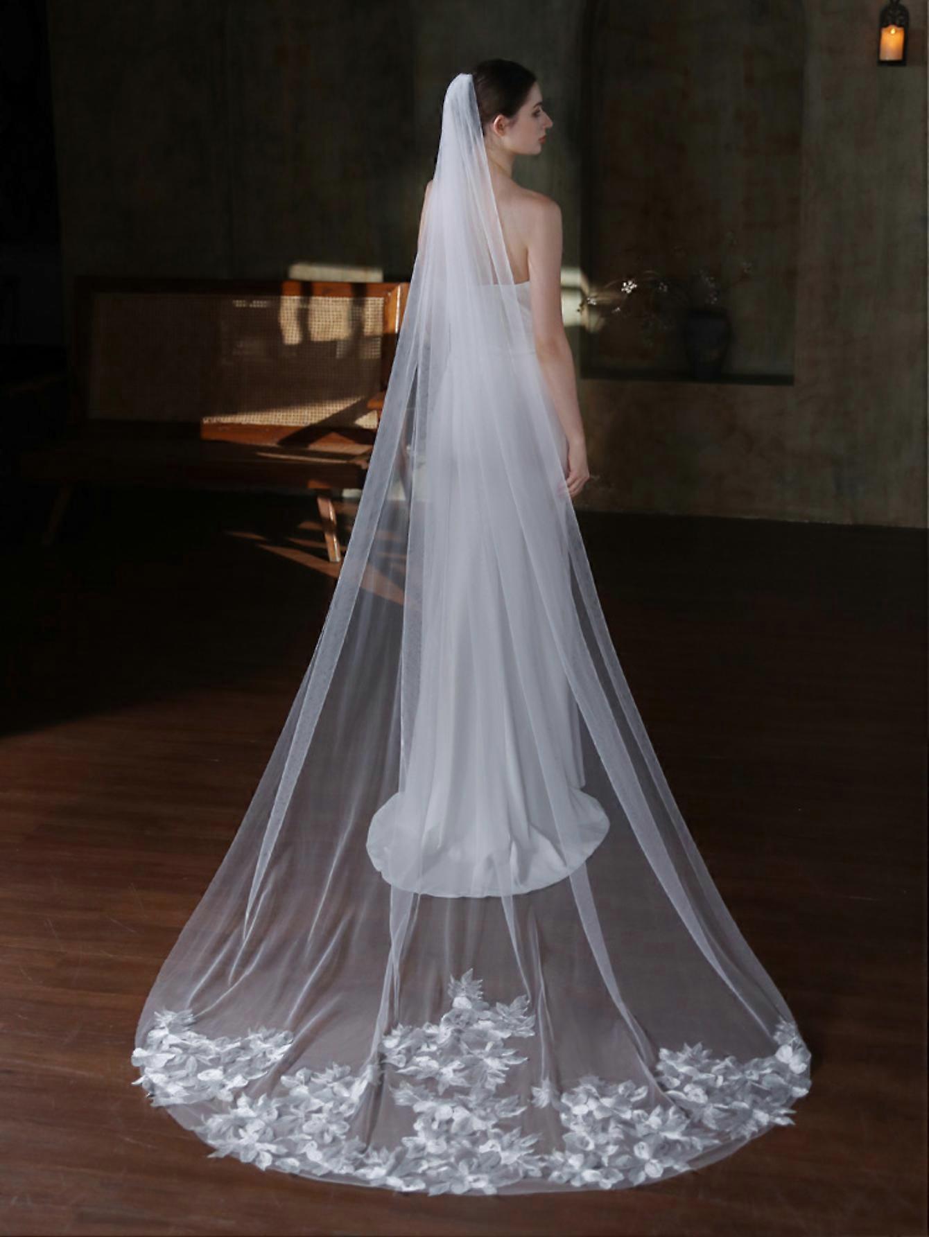 White single-layer bridal veil with lace and train, church wedding, long-Single-layer, long bridal veil made of soft tulle with a lace edge and train, ideal for church weddings.