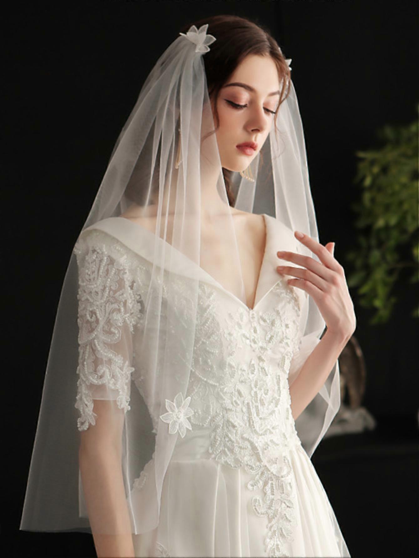 Vintage wedding veil with flowers, white long bridal veil in boho style, double comb fixation, elegant and simple design
