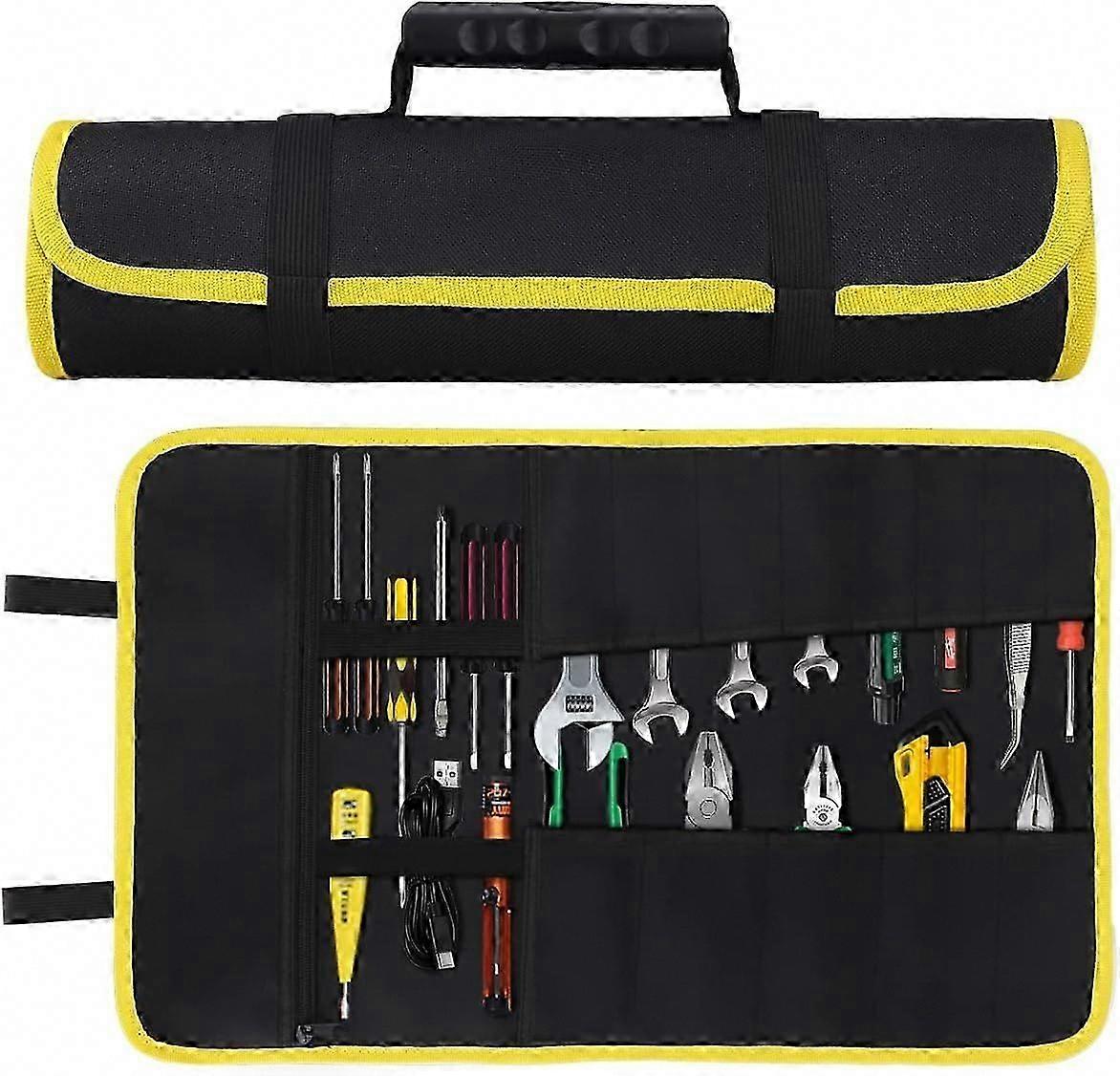 Heavy Duty Tool Bag with Zipper Pockets, Portable Roll Up Organizer for Electrician Plumber Mechanic - Black Oxford