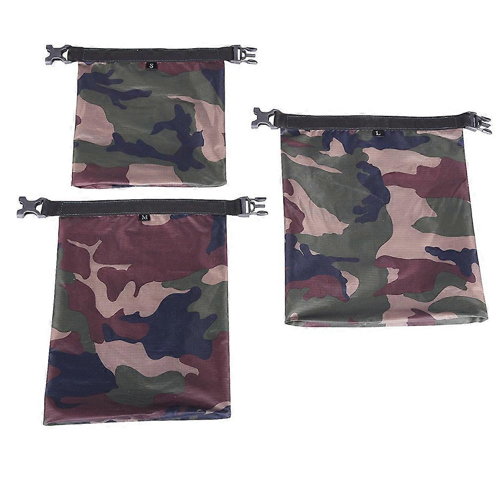 Set of 3pcs waterproof dry bag pouch in 3L, 5L and 8L sizes, made of watertight fabrics with professional treatment for stronger water repellency and durability. PU coating and full-line pressure gluing process and professional waterproof reel design to ensure that the contents of the bag remain dry. Large capacity can effortlessly hold food, drink, clothes and other personal belongings while you are occupied in outdoor activities especially water activities like sailing, drifting, rafting, camping, kayaking, etc. Features - Color: Camouflage - Material: nylon - Size: 29.50X24.00X0.10cm/11.59X9.43X0.04in - Watertight roll-top sealed closure for maximum compression, double stitched and taped seams. - Keep your valuable and perishable items water. - Good for storaging mobile phones, cameras, documents, maps, food, drink, clothes and money, etc. - Essential kit for boating, kayaking, canoeing, camping and other outdoor activities. Package list: 3 x Waterproof bags