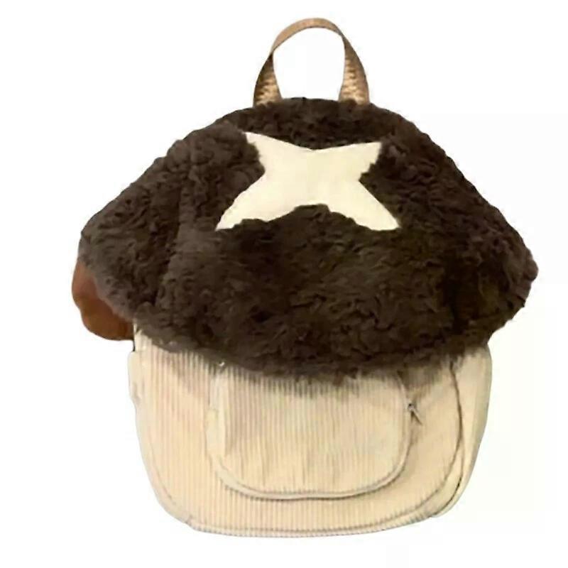 Functional plush backpack with spacious storage. Features cute cartoon mushroom, lovely dolls design, soft material. Lightweight, durable, comfortable. Ideal for school, travel, daily use.