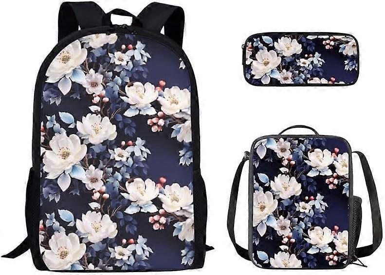 White Jasmine Bookbag and Lunch Box Set Navy Blue Plants Flower Elementary Middle School College Book Bag 3PCS Watercolor Jasmine Floral Backpack for
