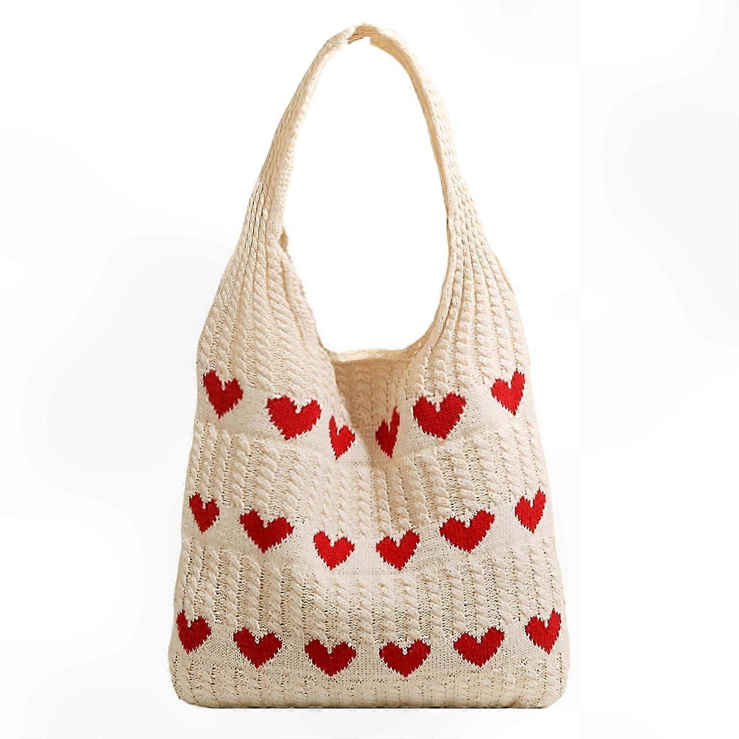 1. Product contents: You will receive a heart-shaped knitted bag measuring 35 x 38 x 1 cm in apricot color. It is a cute and practical shoulder bag for women's everyday use. 2. Product material: This heart-shaped knitted bag is made of polyester, which resists deformation. The exquisite knitting craftsmanship ensures quality. 3. Fashion design: The woven bag features a unique design with a red heart-shaped pattern, exuding sweetness and charm. It enhances your overall look and is ideal for daily wear. 4. Multifunctional use: With ample space, this shoulder bag can easily hold daily essentials like phones, wallets, and cosmetics. It's suitable for shopping, travel, work, and various occasions to meet your diverse needs.