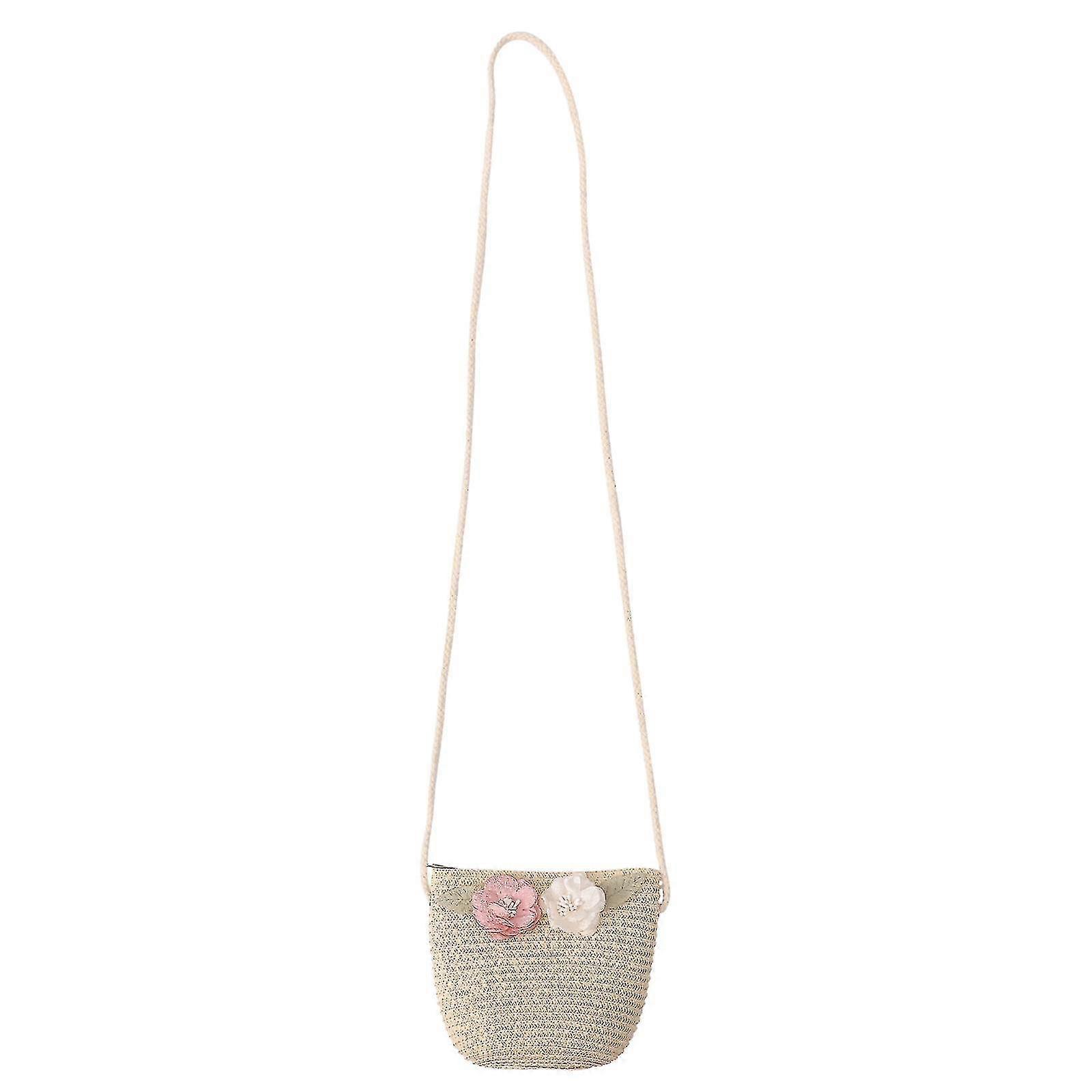 Kids Fashion Straw Crossbody Bag - Lace Flower Handmade Woven Beach Bag Shoulder Bag for Girls (Beige, Random Flower Color)