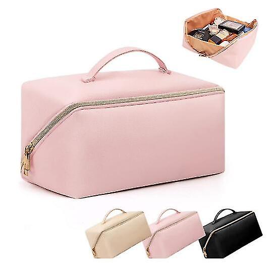 Large Capacity Travel Cosmetic Bag,waterproof Pu Leather Portable Makeup Bag Opens Flat For Easy Access