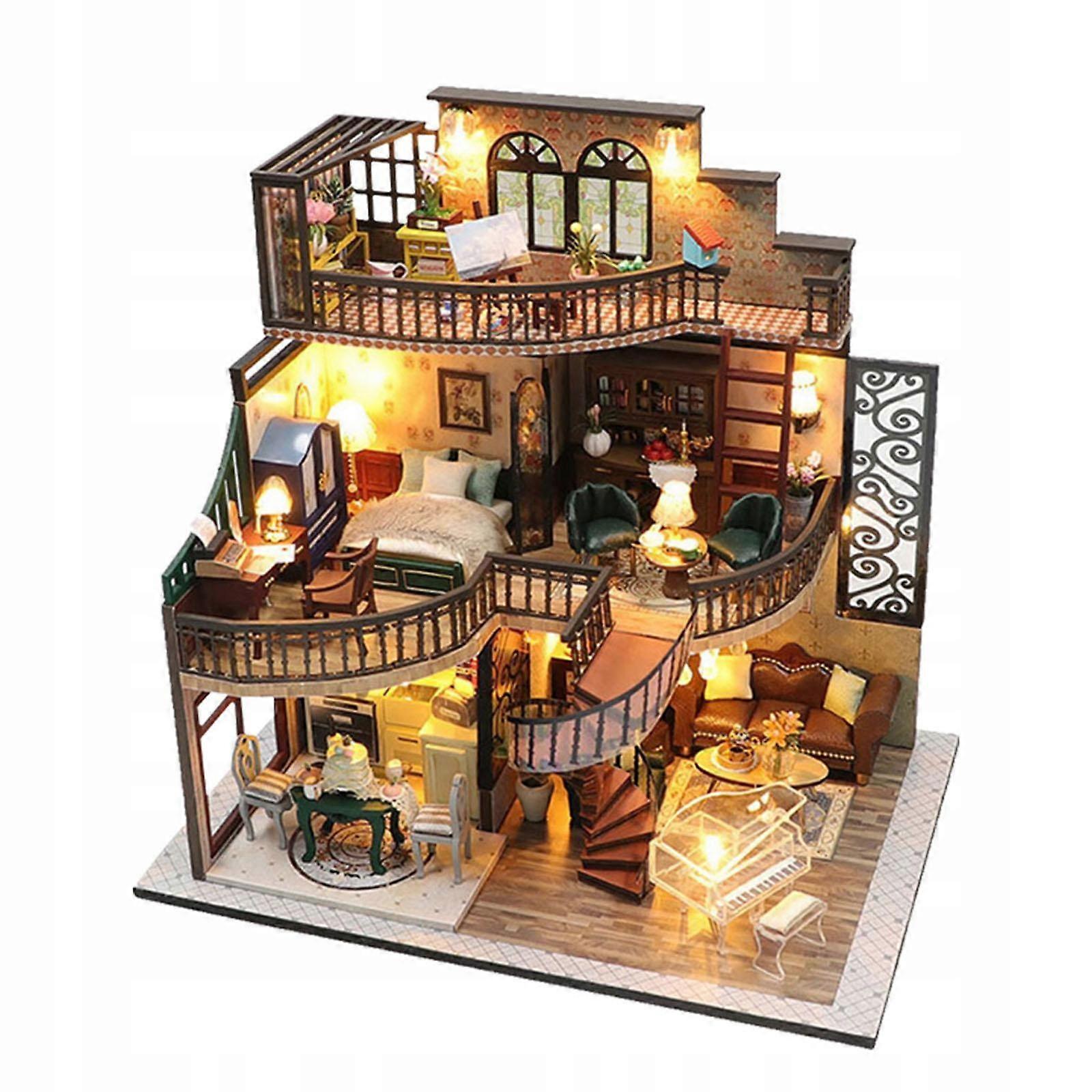 Wooden Led Dollhouse Two-story Retro Model To Assemble Diy Furniture