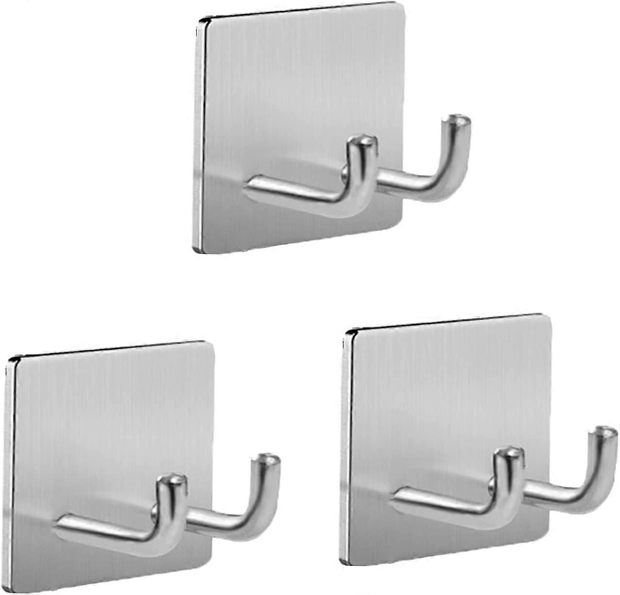 Space Saving & Hanging More - Come with 3 pcs wall hook, and each hook with 2 claws, equivalent to there are six hooks available, make these coat hooks can be hanging more stuffs, and it also can be as a razor holder, phone holder, perfect for hanging towel, coat, bathrobe, keys, utensil and so on HOLDS UP TO 3KG -- Self adhesive hooks is made of 304 stainless steel, which is corrosion resistant, waterproof, scratch resistant and durable. Can hold up to 3kg. Enlarging adhesive 3M sticker to provide stronger stickiness. Easy to Install-- Please use the stick on hook after 24 hours of installation. Just remove the front film cover and peel back cover and press it on the wall, easy and convenient. No drill needed and no worry about damaging the wall with removable hook. Widely Application: This kitchen towel hook can be used on wide a variety of smooth surfaces, such as wood, glass, marble, ceramic tiles, etc. (Theyre not suitable for non-smooth wallpaper wall or plaster wall or any rough textured surfaces). Damage Free Wall HookNo tools, no screws, no drilling holes. it won't damage your walls, just need a few seconds attach to clean smooth surface. Color:Silver Size:45*45*30mm Package include:3*wall hook