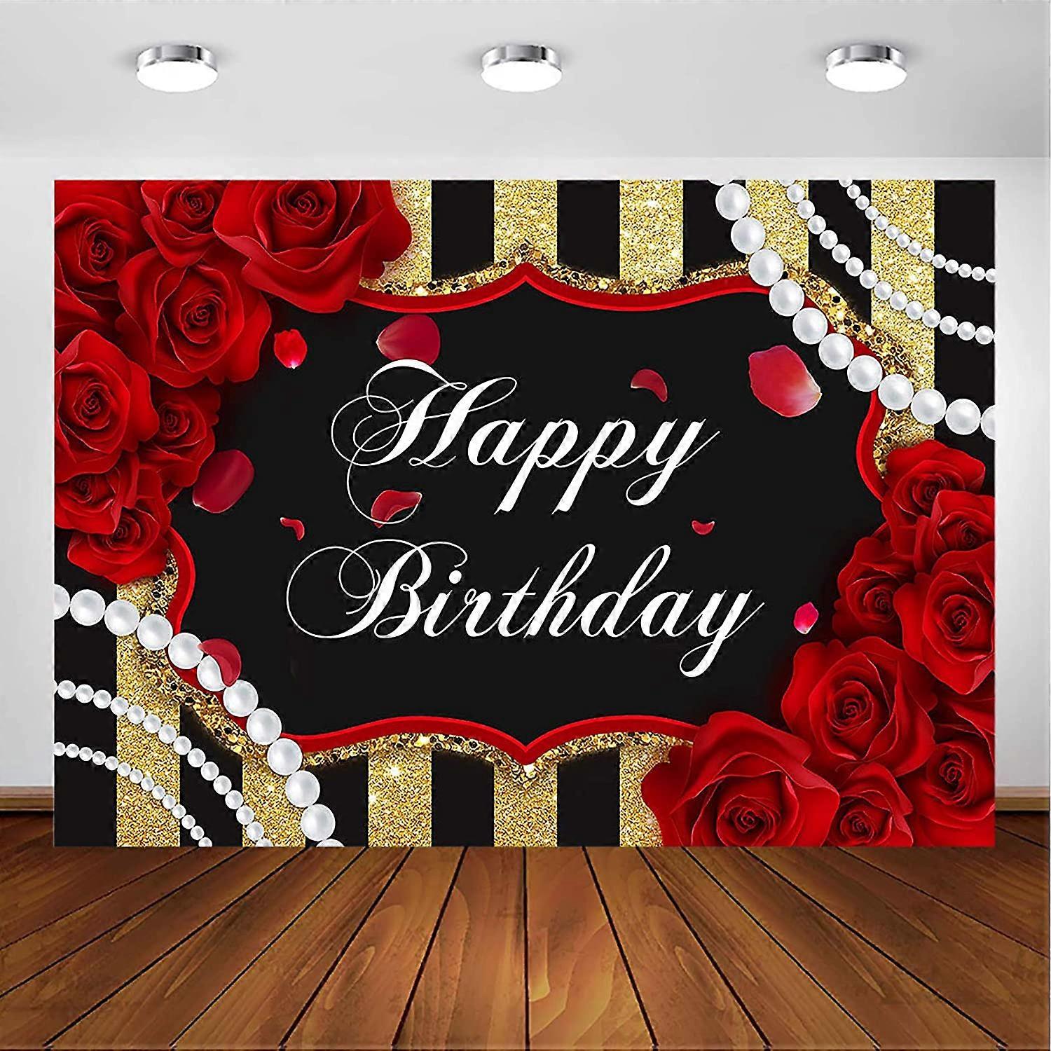 Red Rose Birthday Backdrop for Girls Woman Party Decorations Red Roses Floral Pearl Black and Gold Stripes Happy Birthday Party Banner Photoshoot Phot