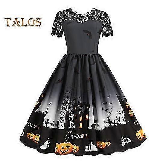 Vintage Bat Print Lace A-Line Halloween Party Dress with Hollow Design