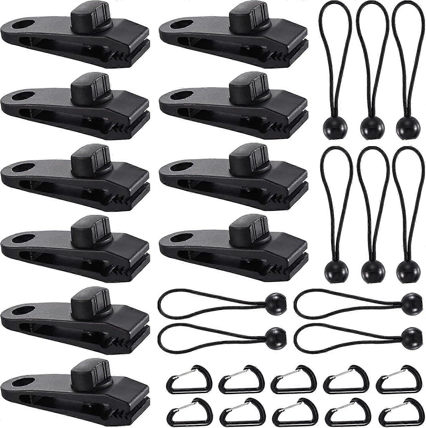 Unique Tooth-Shaped Design: The tent clips is designed as a crocodile mouth tooth-shaped locking clip, the gear-shaped design can firmly clamp the tent, on the other side a hole, metal buttonsor strings can be connected. 30 Pieces Products: Our tent clip set includes: 10 pieces black tarp clips, 10 pieces carabiners and 10 pieces black elastic ropes, enough for daily use. Lightweight and practical, easy to store and carry.Clip size: approx. 8 x 2.7 x 3 cm. Easy to Install: You just need to grab the edge of the tarp and clamp it directly, you can tighten or loosen the screw knob to adjust the strength of the clip, not easy to fall off. Finally secure with a rope. Carabiners and Bungee Cord: High elastic design ensures constant tension and stays firm. Simply pass the bungee cord or carabiner button through the tent's clamping hole to make sure the bearingis secure, you can attach it to loops, poles, logs, ropes, brackets, etc. Wide Application: The tarp clips are specially designed for securing tents, outdoor camping tents, awnings, caravans, trailers, sunshades or picnics and many more. No need to drill holes anddamage the material, light and handy. Features: -The tent clips is designed as a crocodile mouth tooth-shaped locking clip, the gear-shaped design can firmly clamp the tent. - 10 pieces black tarpaulin clips, 10 pieces carabiners and 10 pieces black elastic ropes, enough for daily use. Lightweight and practical, easy to store and carry. - The tarp clip is specially designed for attaching tents, outdoor camping tents, awnings, caravans, trailers, sunshades or picnics and many more. Specification: -Product Name: Tent Clip -Product color: Black -Pliers size (L x W x H): approx. 8 x 2.7 x 3 cm -Length of the rope: approx. 13 cm Scope of delivery: -10 * Black Tent Clip -10 * Elastic cords black -10 * Carabiners