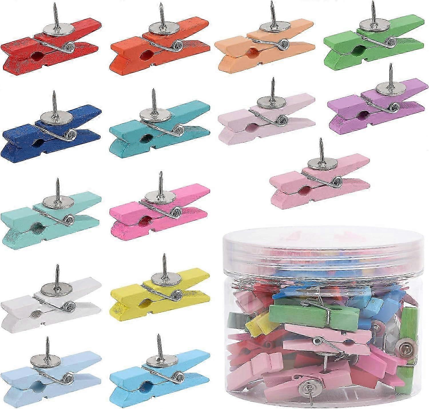 Push Pins With Wooden Clips 50Pcs Wooden Clip Thumbtack for Cork Board Arts Projects Photo Supplies(Colorful)
