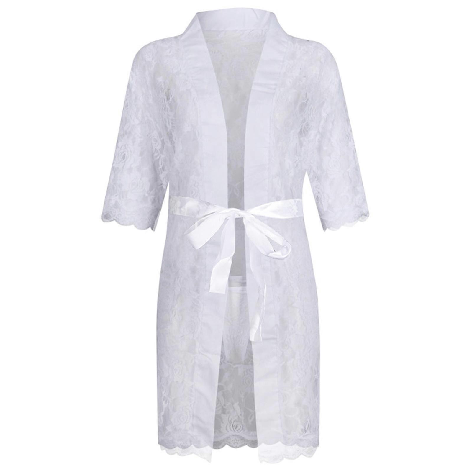 Men's Lace Floral Sheer Night Robe Half Sleeve Cardigan Bathrobe Nightwear Lingerie with T-Back Panty Thong and Belt White XL
