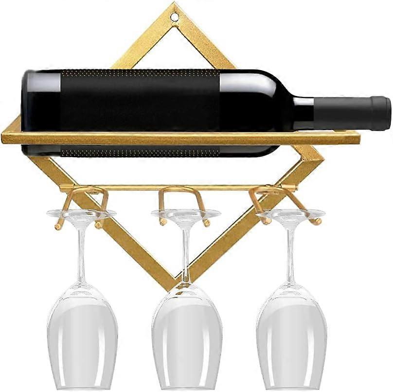 Folding Wall Mounted Metal Wine Rack with 3 Wine Glass Holders (Gold)