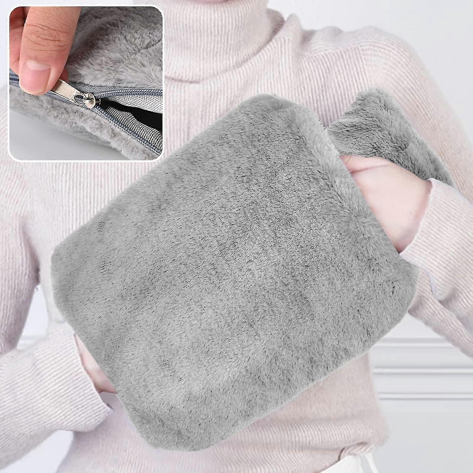 Hot Water Bottle With Cover, 2l Large Hot Water Bottles For Hands, Grey Fluffy Hot Water Bag With Zipper Cover Easy Take A