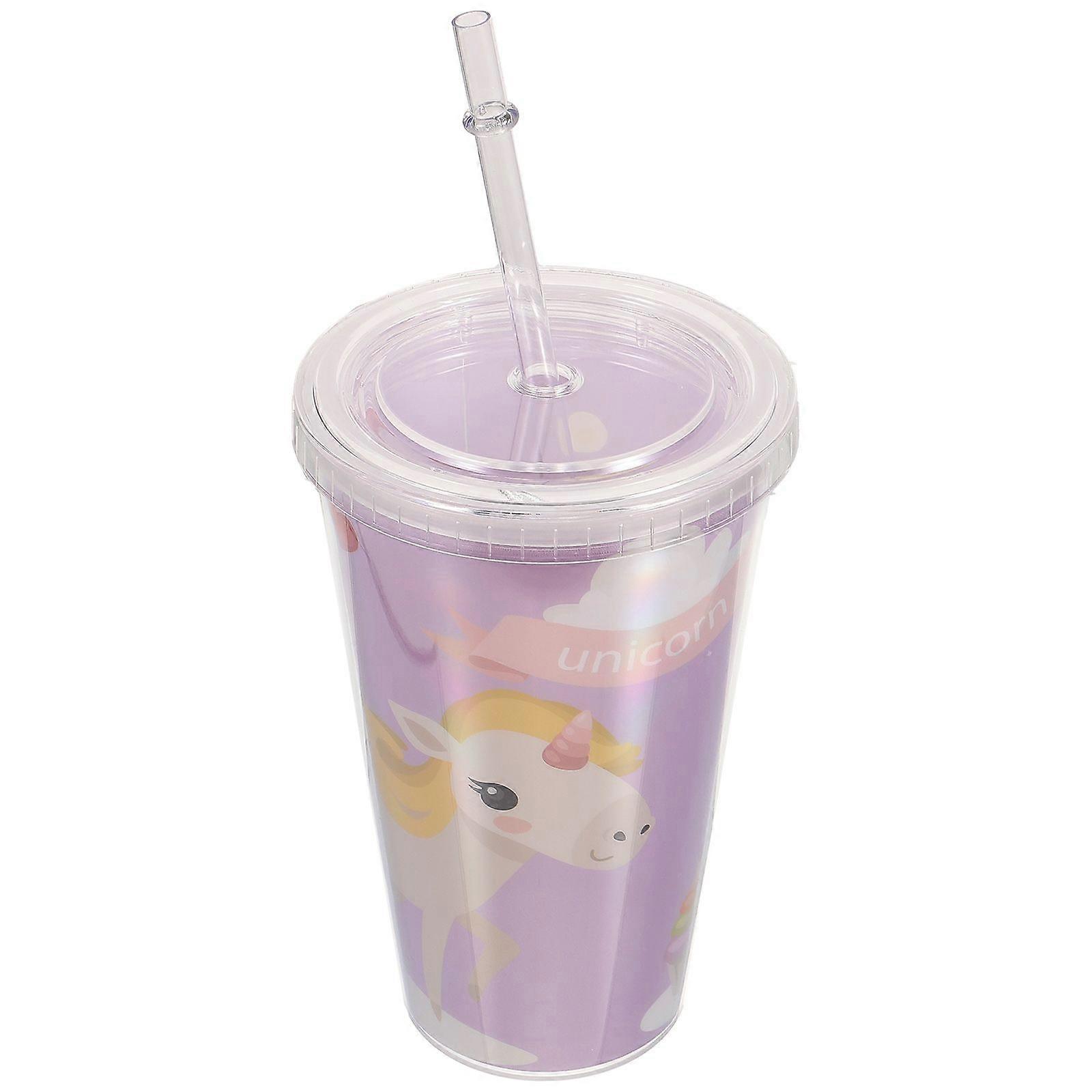 450ml Portable Drinking Water Bottle with Straw Double Layer Straws Water Cups Plastic Fashion Drinking Mug (Happy Unicorn)