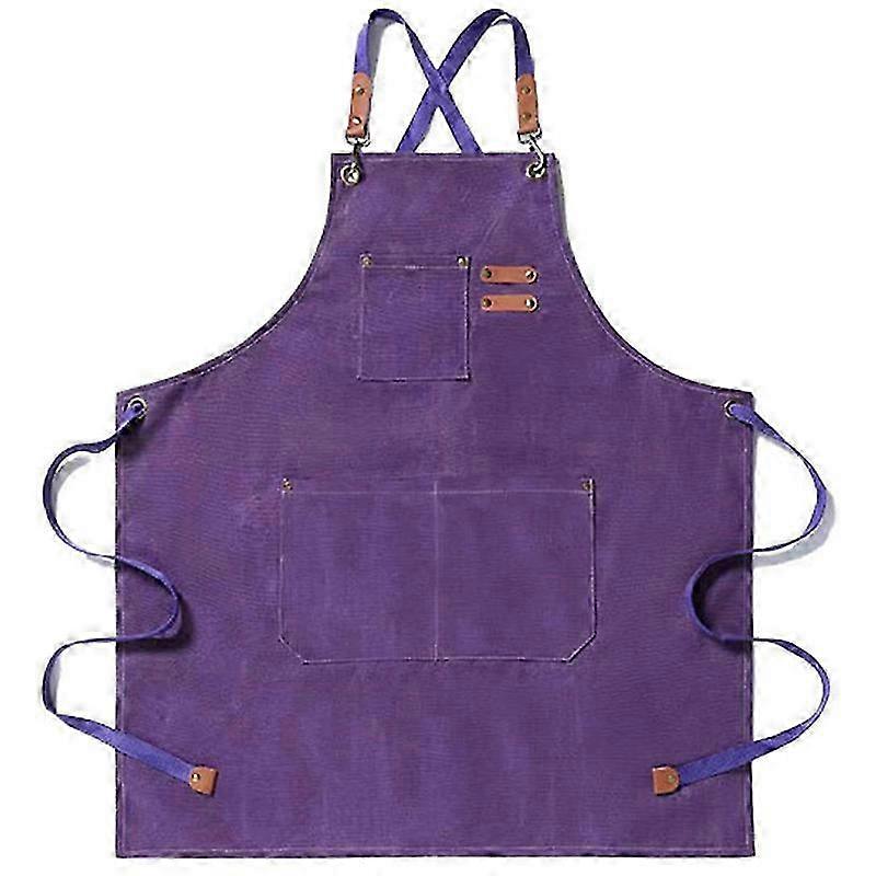 Canvas Kitchen Apron for Men Women Chef Cooking Apron Cross Back 3 Pockets(Purple)