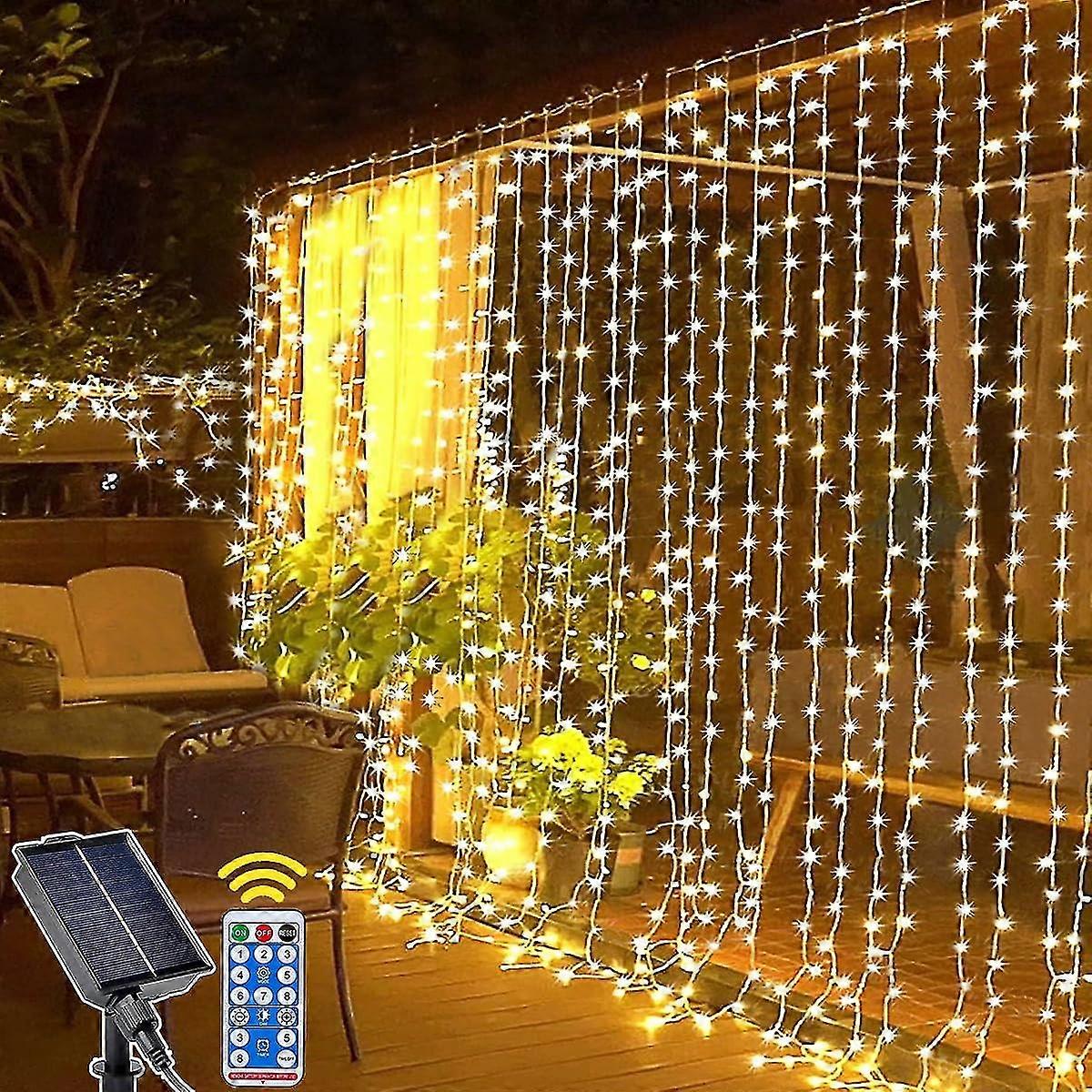 300 Super Bright LEDsThe solar light curtain has 12 wires, 300 LEDs in total. Easily create a 3m (length) x 3m (height) waterfall light. Easy to install and use It is easy to attach the solar panel to the ground using the spike . When the ON/OFF button behind the rear solar panel is turned on, the solar panel is working 8 modes The solar curtains have 8 modes. You can switch modes by changing the button and enjoy the beautiful light strips, easily creating a romantic and relaxing atmosphere. Waterproof Our LED lamp beads are made of high-quality materials and can withstand rain or high temperatures, making them ideal for indoor and outdoor decoration. No need to worry about rain outside. You don't have to worry about placing the curtains in a damp place or exposing them to rain. Widely used: Waterproof design makes these Christmas string lights suitable for indoor decoration and exterior. These string lights add a romantic atmosphere to your garden, restaurant, bar, patio, party, wedding and more.
