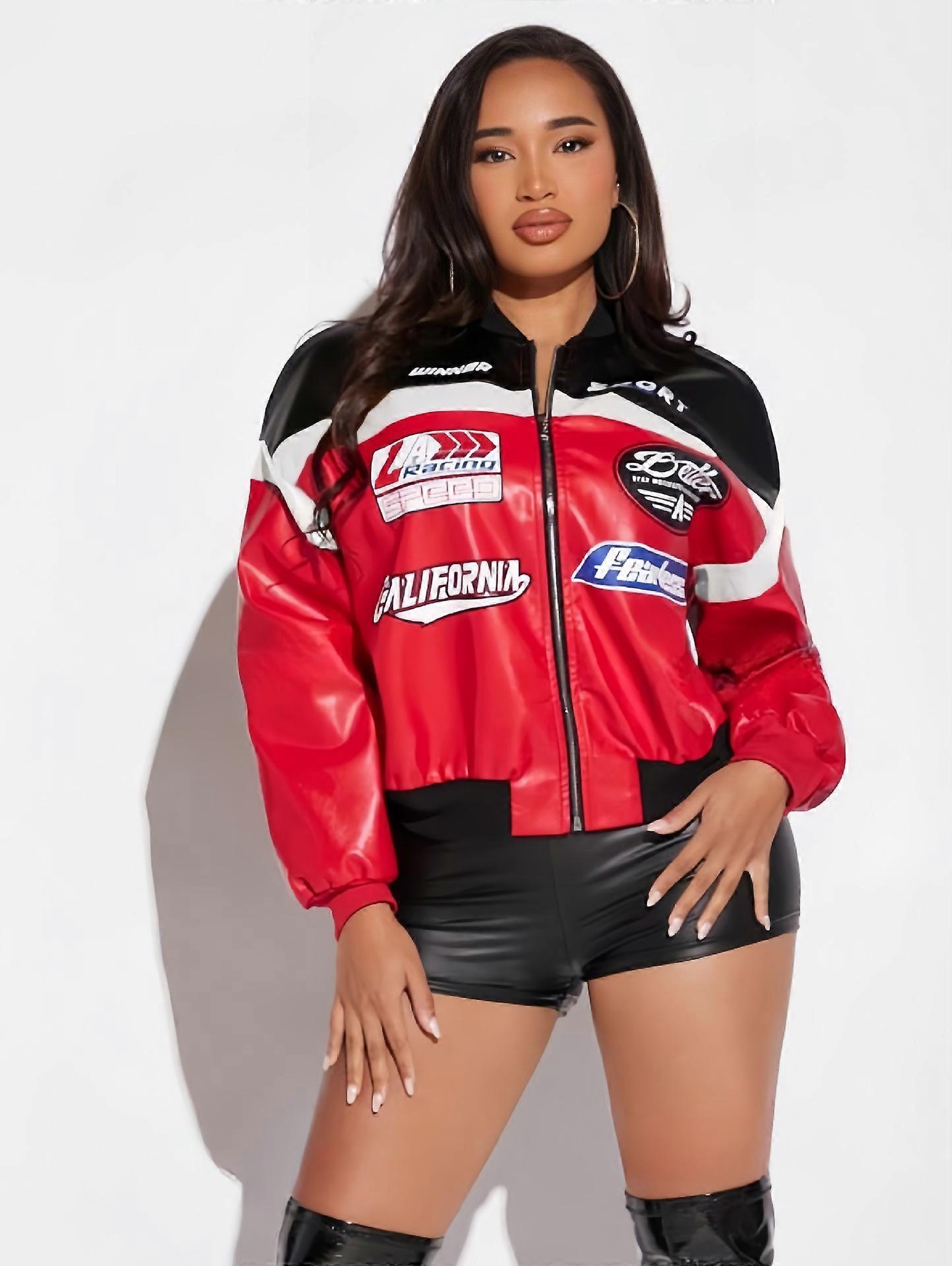 Contrast Color Letter Print Leather Jacket 2025 Autumn Winter New Street Long Sleeve Coat Short 40cm
