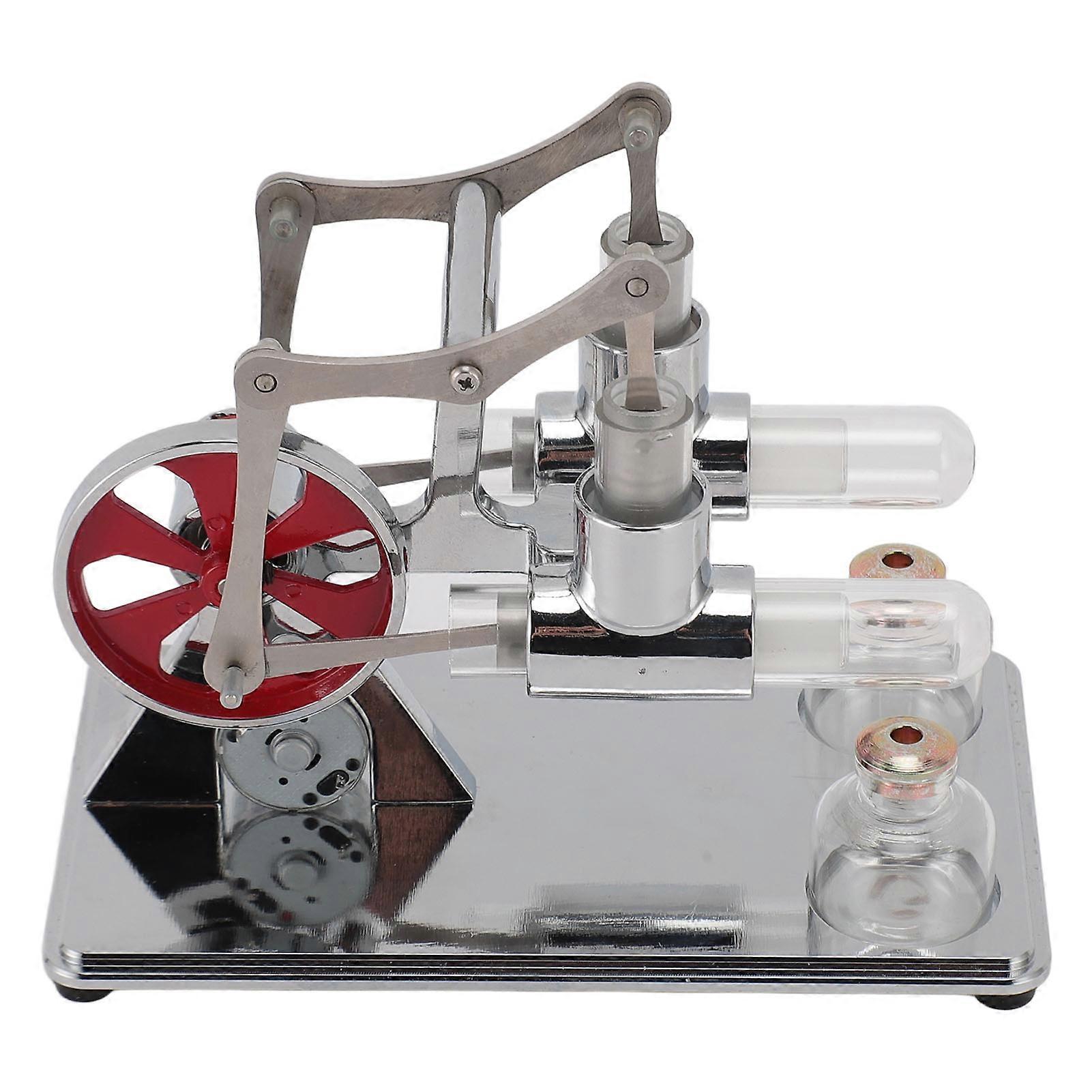 Stirling Engine Model Kit Early Educational Double Cylinder All Metal Wooden Base Stirling Engine Motor Model for Science Physics Experiment Silver