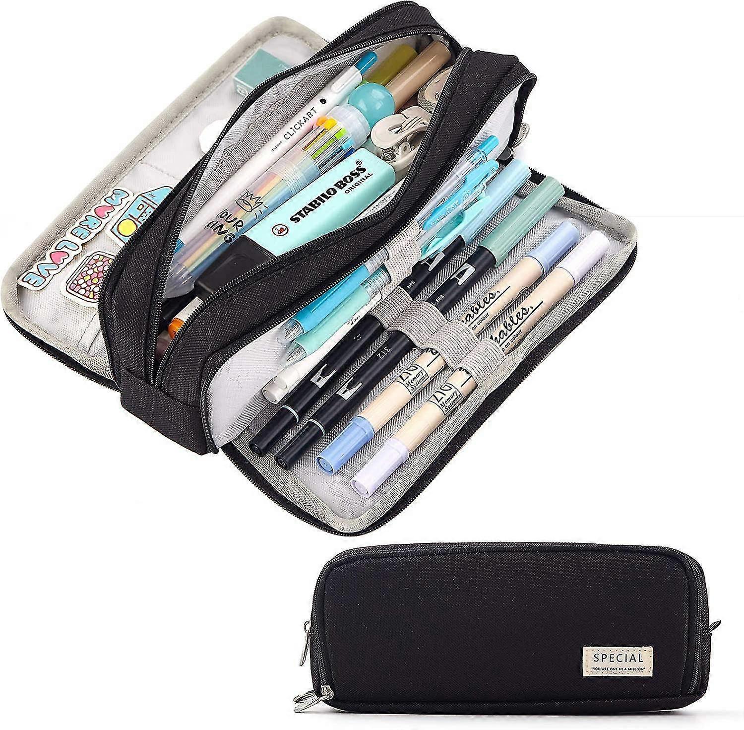 Large Capacity Pencil Case 3 Compartment Pouch Pen Bag For School Teen Girl Boy Men Women (black)