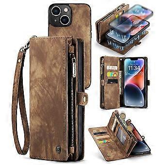 CASEME 008 Series for iPhone 14 PU Leather Zipper Pocket Detachable Magnetic Phone Case Multi-Functional Wallet Stand Cover with Strap Brown