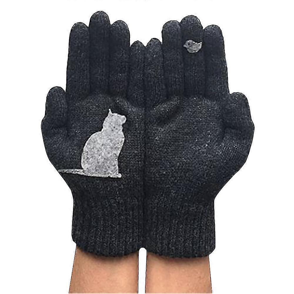 Womens Ladies Cashmere Winter Warm Cat Printed Knitted Full Finger Gloves Mittens