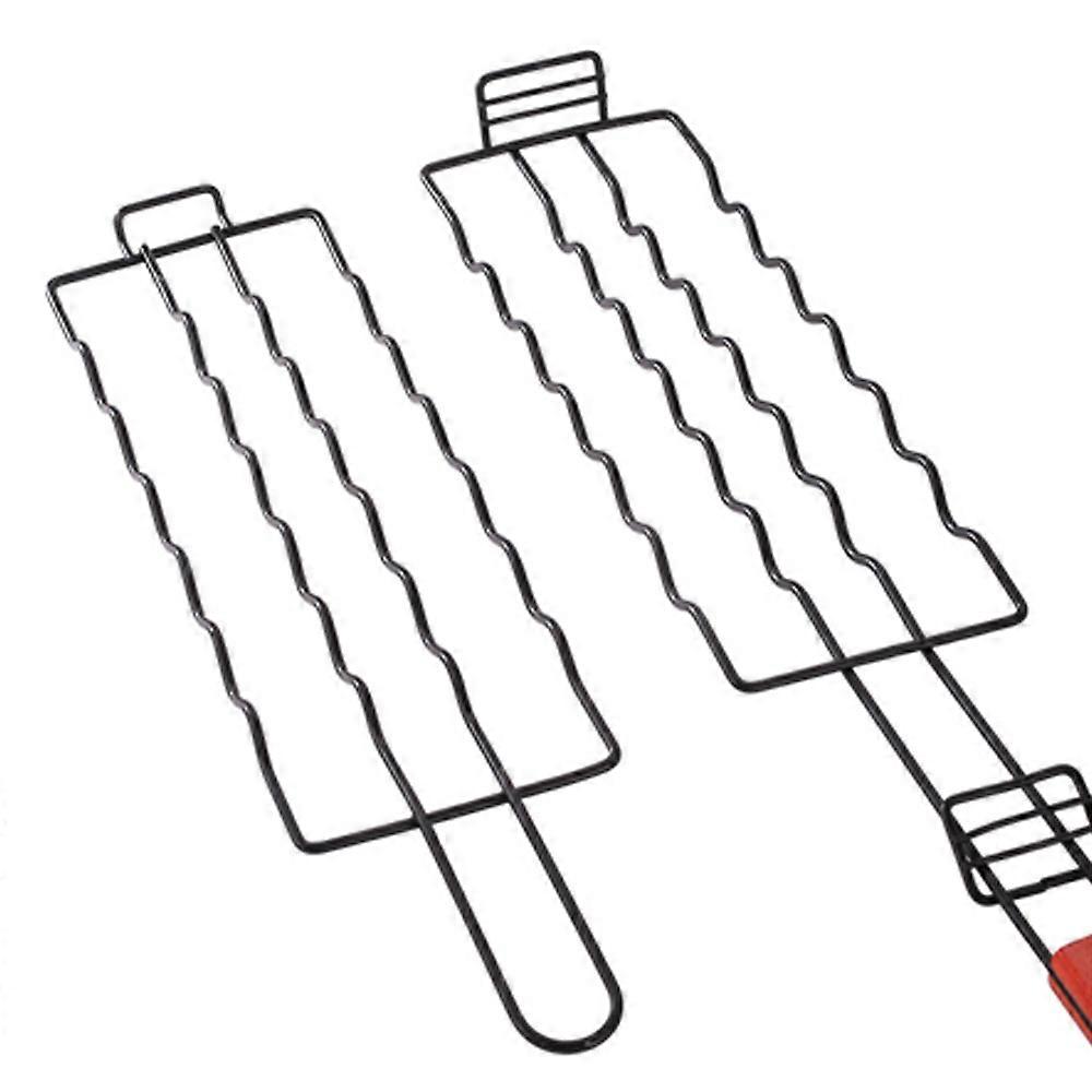 BBQ Sausage Grilling Basket Grilling Net for 6 Hot Dogs with Wood Handle Portable Barbecue Spatula for Camping, Picnic