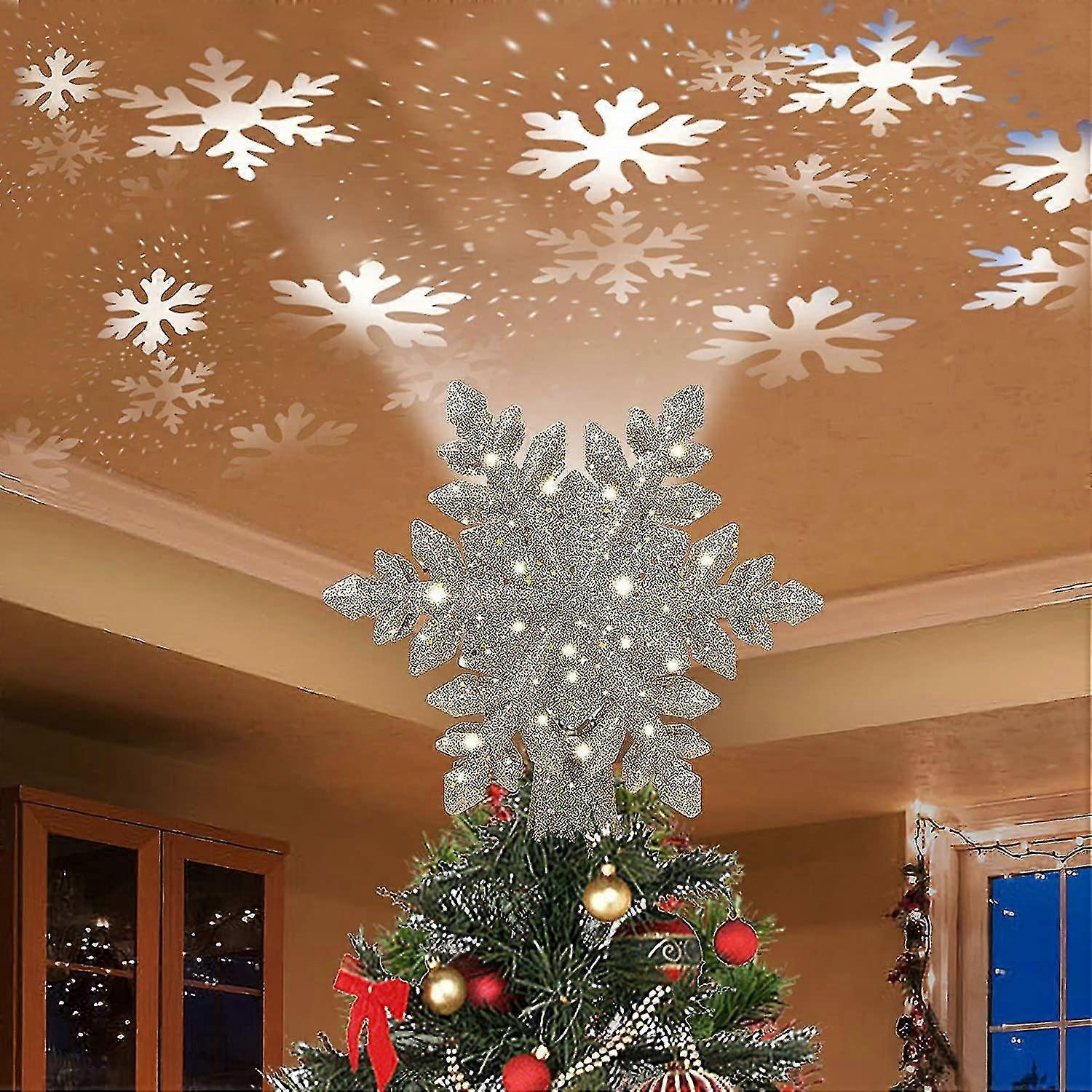 Christmas Tree Topper Lighted With Golden Snowflake Projector, Led Rotating Magic Snowflake, 3d Hollow Glitter Lighted Gold Snow Tree Topper For Chris