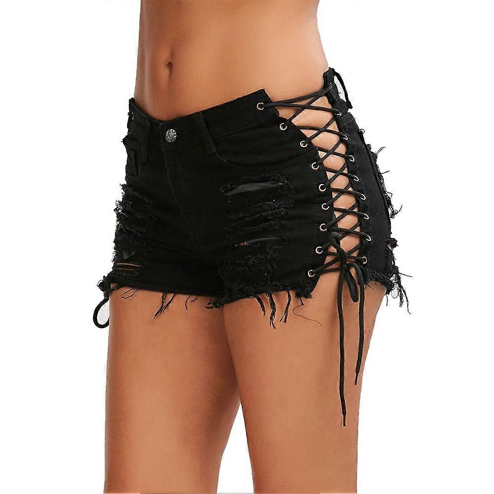 Tassel Lace Up Shorts High waist Summer Short Jeans Short Pants (Black L)