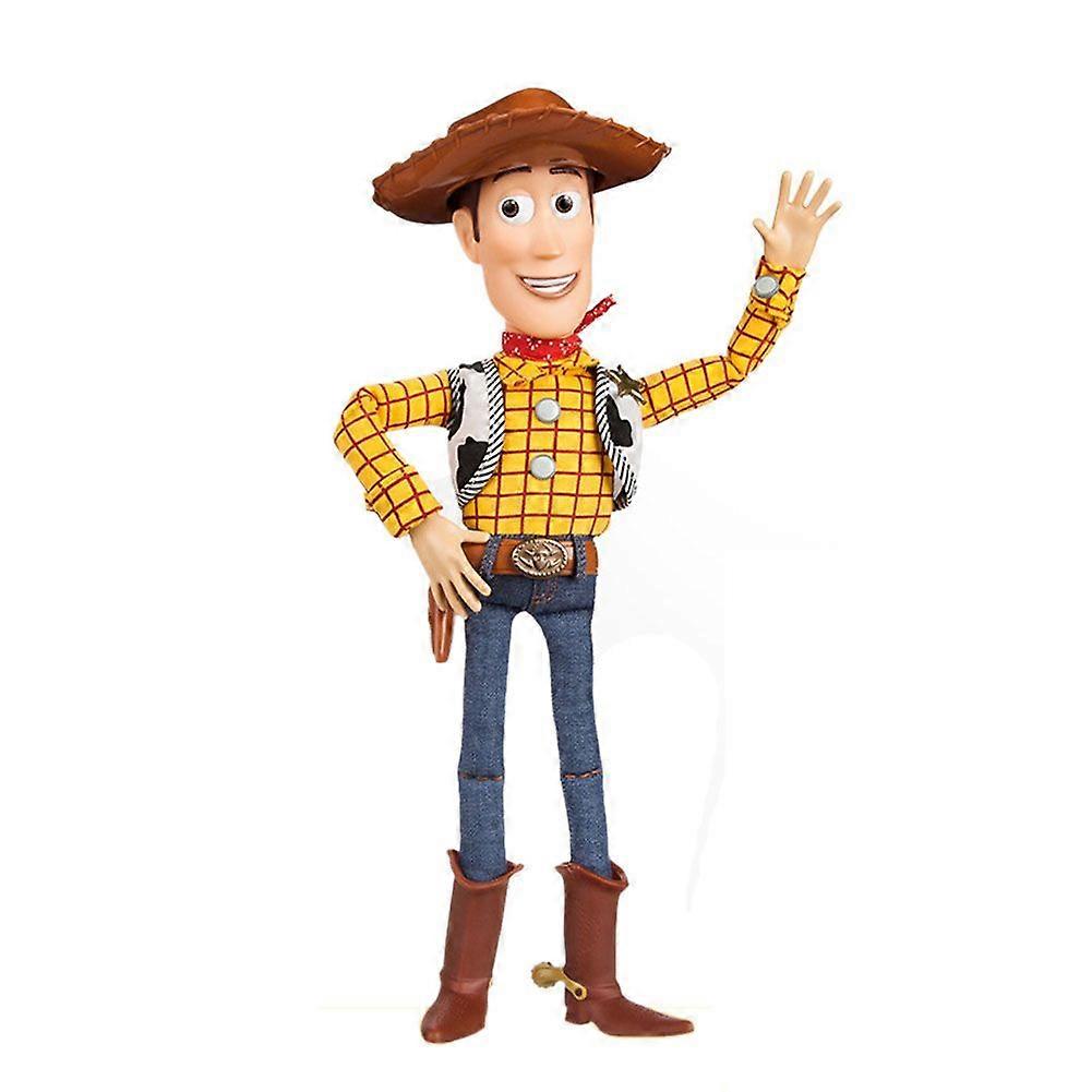 Sheriff Woody is about 16 inches (40cm) tall. His body is of cotton-filled denim, and the limbs of his head are plastic. Can say more than 30 pronunciations and can sing. Material: plastic fabric Packing size: about 18x10x45cm danger warningChoking Hazard ------ Small parts, not suitable for children under 3 years old.
