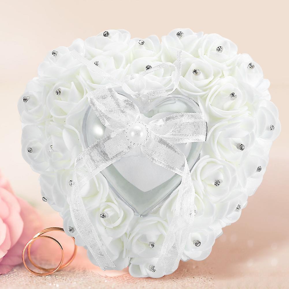 Romantic Heart shaped Wedding Ring Box Rose Rhinestone Decor Ring Pillow Cushion(White)