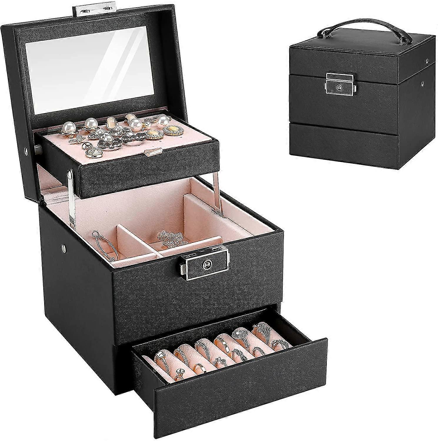 Jewelry Box For Girl Women Traveling, Ideal Gift Small 3 Layers Jewelry Organizer Display Storage Holder Case With Mirror Lock For Earrings Rings Neck