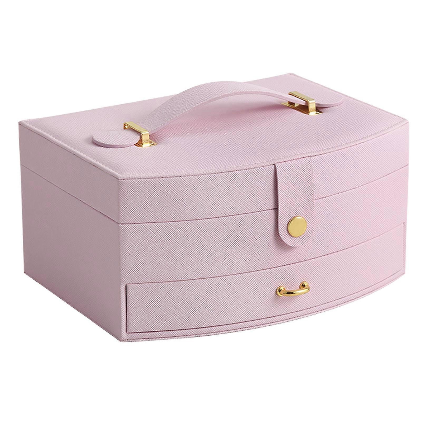 Jewelry Box with Mirror Drawers Large Capacity PU Leather Portable Double Layers Jewelry Case Pink
