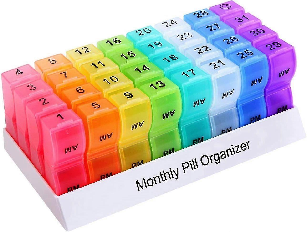 Monthly Pill Organizer Box - 31 Day AM/PM Daily Pill Case 32 Compartments for Each Day, Pill Dispenser Container to Hold Vitamins, Supplements and Medication Plan Pills and Vitamins A Month In Advance: Our monthly pill organizer is easy to fill so you can plan your am/pm pills vitamins for an month at a time. You'll never have to worry about not having enough storage for your long-term medication. Easy To Track: 31 day monthly pill case features 32 numbered and brightly colored translucent compartments, so its easy to track whether you took your pills for the day. This twice-a-day pill organizer saves you time and is the best option in monthly pill organizers for travel. Clever Removable Design: Each pill box features a snap shut lid that securely locks, preventing your pills, medications, vitamins, and supplements from accidentally falling out when not in use. Moreover, the lid of each compartment is easily removed for filling a months medication. Detachable Daily Am/Pm Compartments: Our monthly pill dispenser comes with a soft-touch, gray plush pouch. You can grab each days compartment and toss it in the gray plush pouch for convenient on-the-go portability.