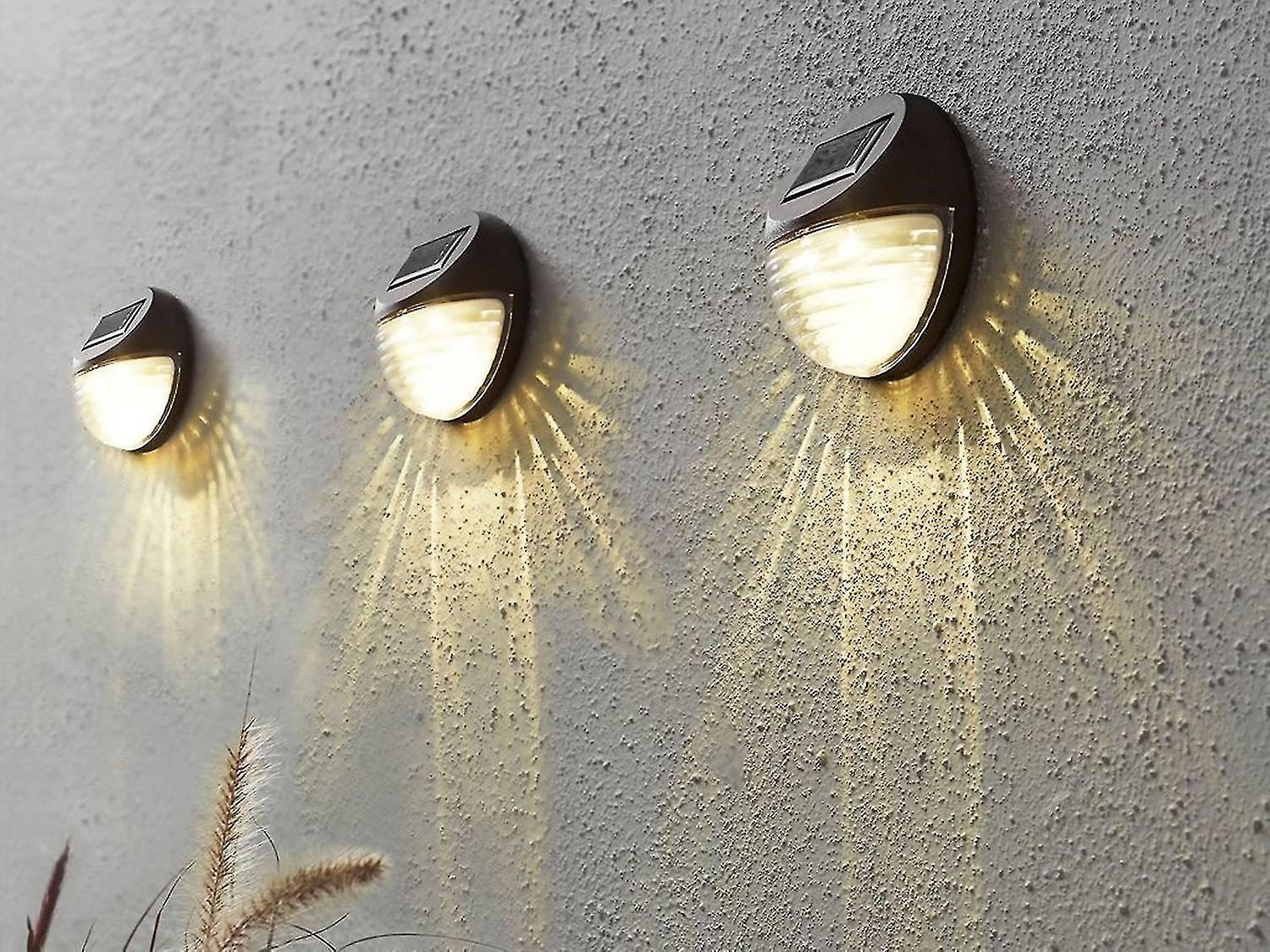 Decorative LED solar light for the facade This set of 3 facade lamps does not require any cables or an electrician to connect them. A dowel and a screw are enough to attach the light to the facade. The LED light is charged via the solar panel on the top. When dusk falls, the integrated twilight sensor switches the light on automatically. It then lights up for approx. 6 hours. The diameter of the lights is 11cm. The waterproof housing also allows mounting on the weather side. The powerful solar batteries are already included in the scope of delivery. Housing color: dark brown Width: approx. 11cm Height: approx. 11cm Power supply: solar light sensor Note: At the beginning of the season, the light needs approx. 36 hours of sunshine to fully charge the battery. After that, normal sunny days are sufficient. So at the beginning please set to ON during the day and OFF in the evening. Solar lamps save energy - and are a good alternative for lighting on the outside walls where there is no electricity connection. 1 set of LED wall lamps consisting of 3 lamps, individually positionable, each lamp is illuminated with 2 LEDs in warm white with twilight sensor Material: plastic in brown and transparent due to the wavy shape of the clear plastic, the light falls radiantly on the surface in the upper area the solar module (5.5x3cm) switch and battery compartment are on the back of the lamp battery included (3x 1 AA Ni-MH 1.2V 200mAh) dimensions of the lamp: H 11 / W 11 / D 4.5cm simple fastening material for wall mounting is included IP44 = for outdoor use Instructions are included, please note the instructions for charging Delivery without any decoration shown Scope of delivery: 1 set of LED solar wall lamps Design and material: Material: plastic Color: Brown Technical data: Connection voltage: 1.2 VProtection type: IP44Data on the Illuminant:Light technology: LEDDesign: LED boardData on the sensor:Type: Twilight sensorData on the solar panelType: Ph otovoltaikLight duration: 6 hAdditional functions / accessories: Mains plug: NoLight source: Yes, permanently installedVarious: 3x AA NiMH rechargeable 1.2V 200mAV6h; with twilight sensorTime setting: 45 sec.Item dimensions and weight:Height: 110 mmWidth: 110 mmDepth: 40 mmProduct weight: 0.01 kgTyp :Outdoor wall lighting Color of product:Brown International IP code:IP44 Suitable for outdoor use:Facade Built-in sensors:Twilight sensor On/off switch:Yes Number of bulbs:3 Bulb(s) Bulbs included:Yes Bulb type:LED Qty of LEDs:2 Total power:0.13 W Flash output:0.064 W Light colour:Warm white Voltage:3.2 V Lamp life (in hours):50000 h Energy source:Rechargeable battery, solar Number of supported rechargeable batteries/batteries:3 Rechargeable battery/battery technology:Nickel-Metal Hydride (NiMH) Battery Type:AA Battery Life:6h Working Voltage:1.2V Width:110mm Depth:40mm Height:110mm Quantity Per Pack:3 pc(s) Batteries Included:Yes LED Solar wall sconces' Fency', set of 3 colour: silver, each 11 x 11 cm, each 2 warm white LEDs, with solar panel, incl. rechargeable battery, outdoor, four-color cardboard wall lights Trio for outdoor use Effective lighting of garden fences, facades etc. Wall light in a set of 3 Effective light emission through Lamella structure Including mounting material Ideal for use on garden fences or facades where there is no power supply. The lamellar structure of the cover creates an effective aureole below the light. The batteries are charged by the solar panel in the upper area of the lamp and then the warm white LEDs light up when dusk falls Technical data 2 warm white LEDs each Battery 3 x AA NiMH IP 44 Light duration up to 6 hours Material plastic Dimensions: each approx 11 x 11 x 4 cm Scope of delivery 3 pieces of wall lights Mounting materialWith this solar light you get a light that bathes your home in a very special way in pleasant brightness.