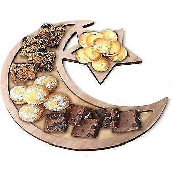 Wooden Serving Tray Plate, Eid Mubarak Moon and Star Shaped Platter Dessert Pastry TraySnack Tray For Home Party Decoration