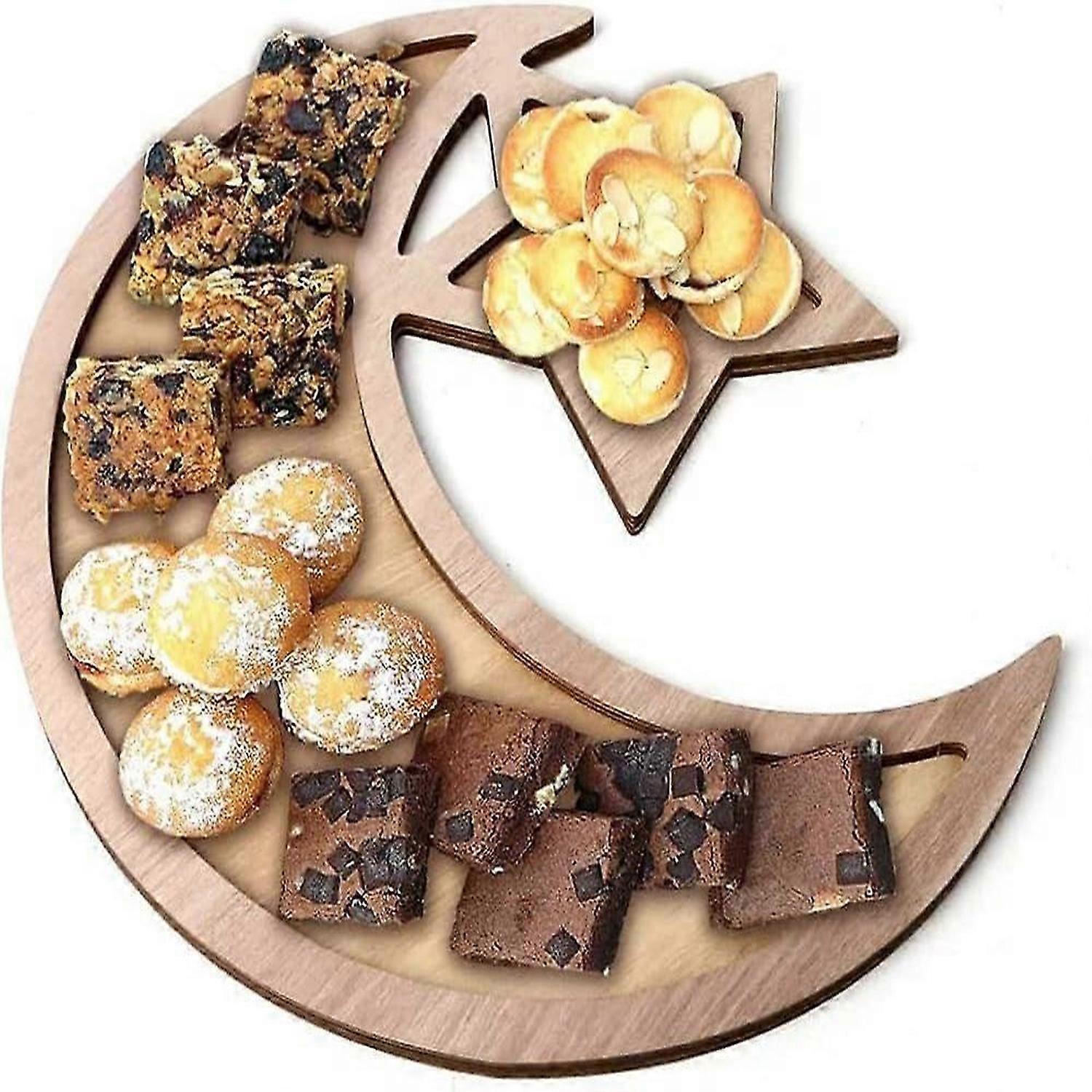 Wooden Serving Tray Plate, Eid Mubarak Moon and Star Shaped Platter Dessert Pastry TraySnack Tray For Home Party Decoration