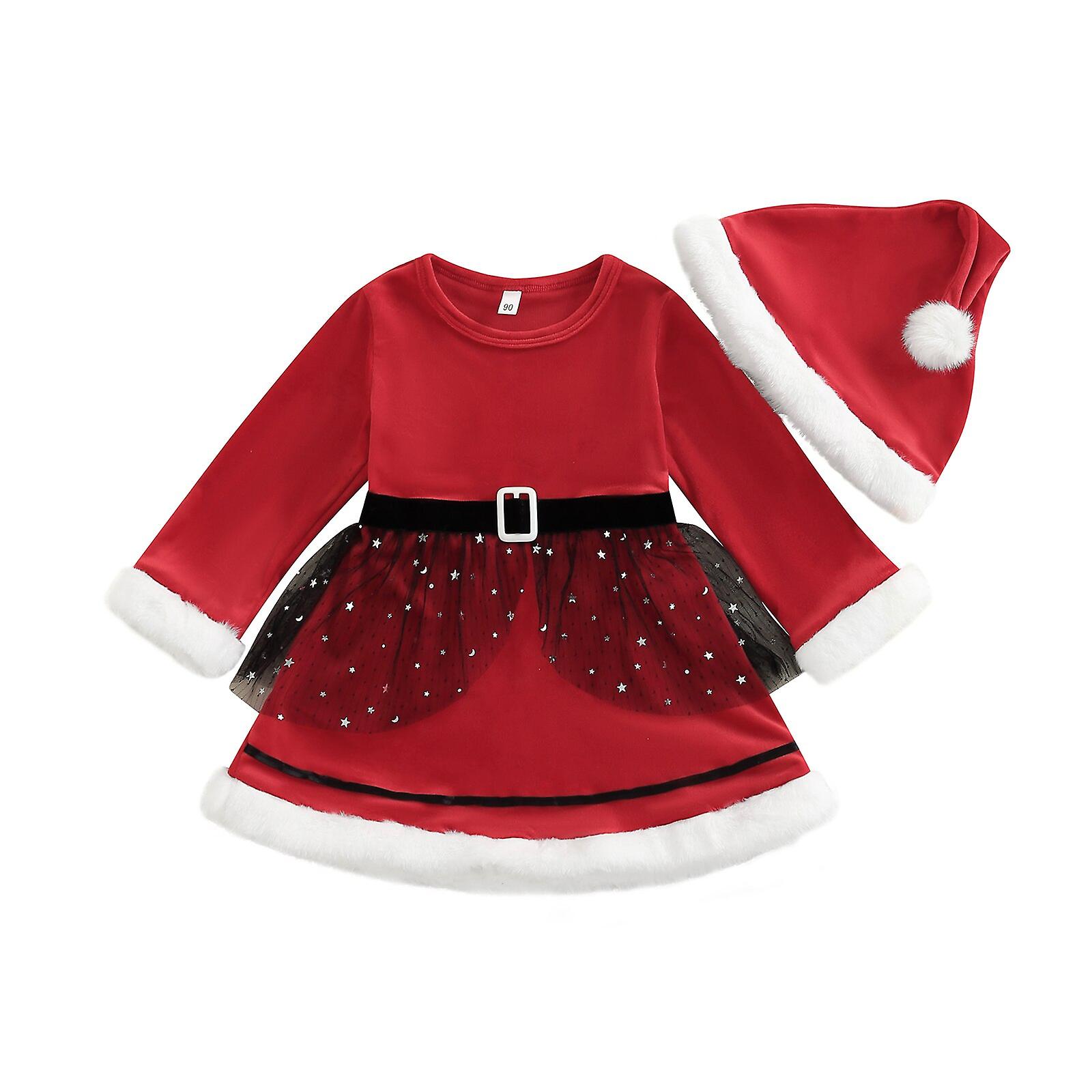 Baby Girl 2pcs Christmas Outfits, Long Sleeve Plush Trim Belted Dress + Santa Hat Set 1-6t