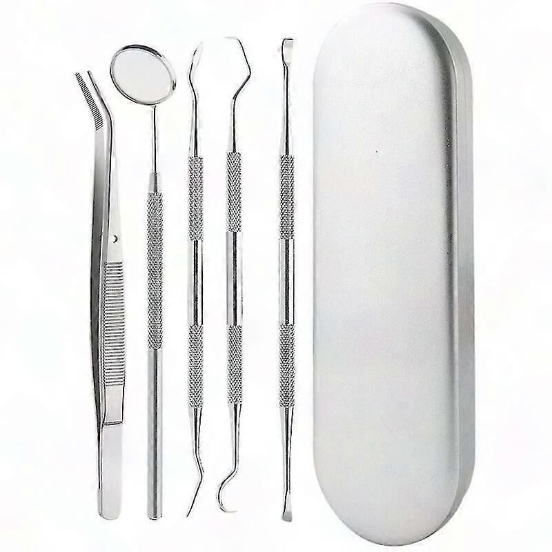 Professional Dental Kit 5pcs: Mirror, Pliers, Sickle Scraper, Tartar Remover & Double Chisel for Oral Hygiene - Silver