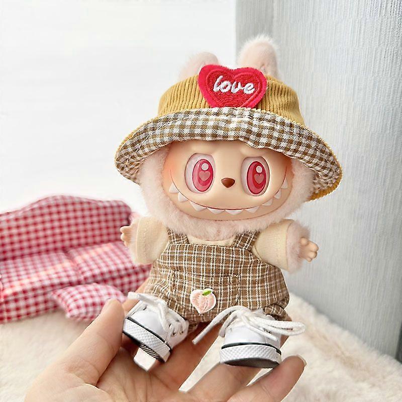 AU Beige Shirt Bib Pants Two-piece Set + Yellow Love Hat + White Canvas Shoes, Labubu Sitting Doll Clothes Set (Clothes Only)